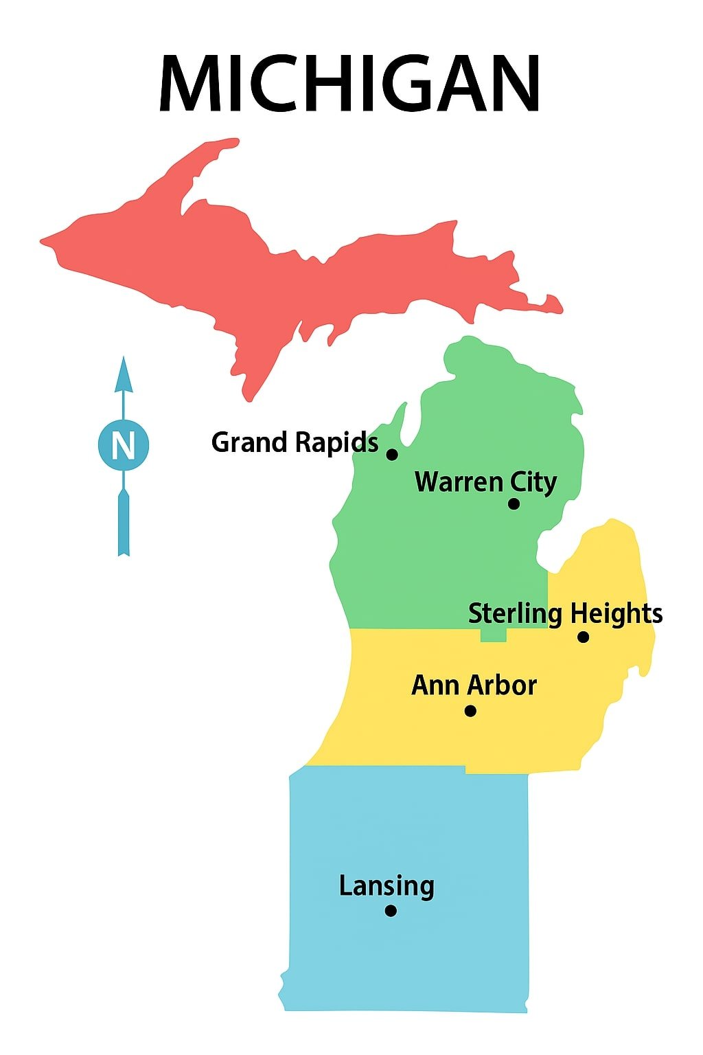Michigan became a state in 1837, with a rich history from Native American tribes and French fur traders to the automotive boom. Visitors can enjoy Detroit’s cultural attractions, explore Mackinac Island, or experience the scenic beauty of the Upper Peninsula. Popular spots include the Mackinac Bridge, Sleeping Bear Dunes, and the Henry Ford Museum. Outdoor activities like boating, hiking, and skiing are local favorites.